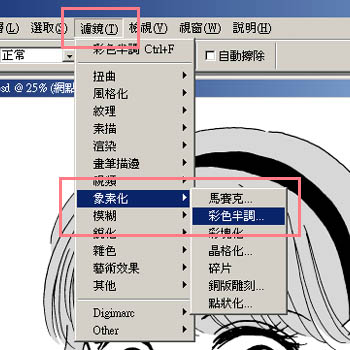 圖層停留在《網點2》圖層不動,選擇《濾鏡》→《象素化》,然後再選擇《彩色半調》。