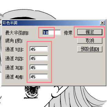 接著會跳出小視窗,這時候就要來調整網點的圓點大小了。若琪選擇10像素,角度全部選擇45度,調整好之後按右上方的《確定》。