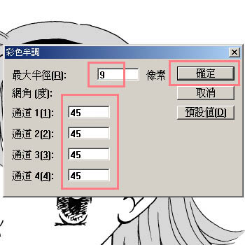 接著會跳出小視窗,這時候就要來調整網點的圓點大小了。若琪選擇9像素,角度全部選擇45度,調整好之後按右上方的《確定》。